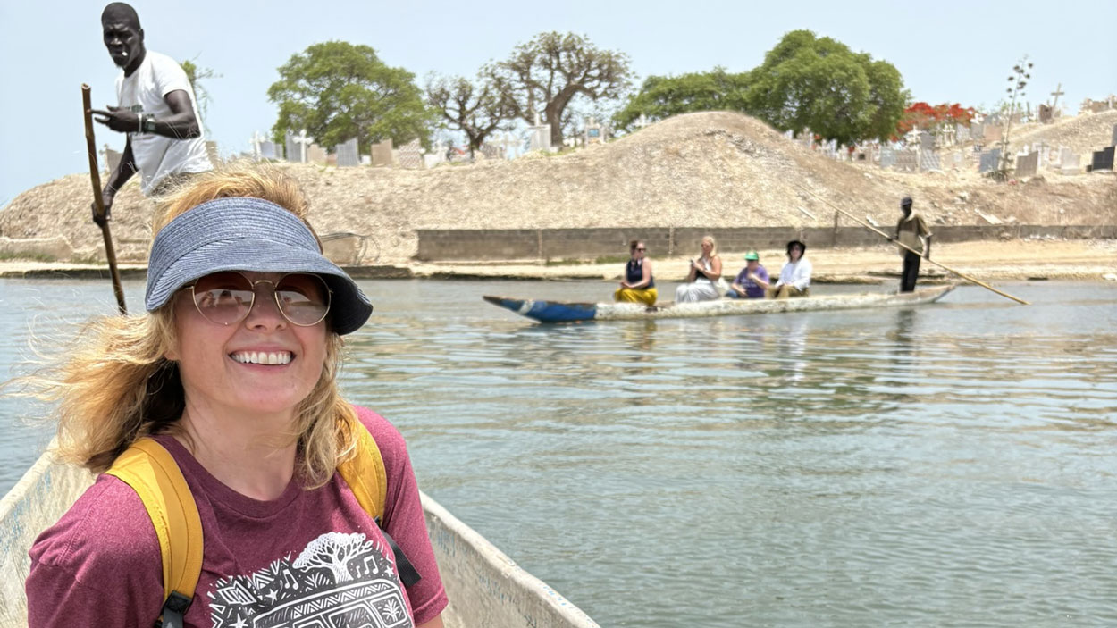 Associate Teaching Professor Violaine White takes a ride in a pirogue near Joal-Fadiouth in Senegal. White spent two weeks immersing herself in the culture of the French-speaking nation on the West African coast with support from an UMSL Global International Fellowship. (Photo courtesy of Violaine White)