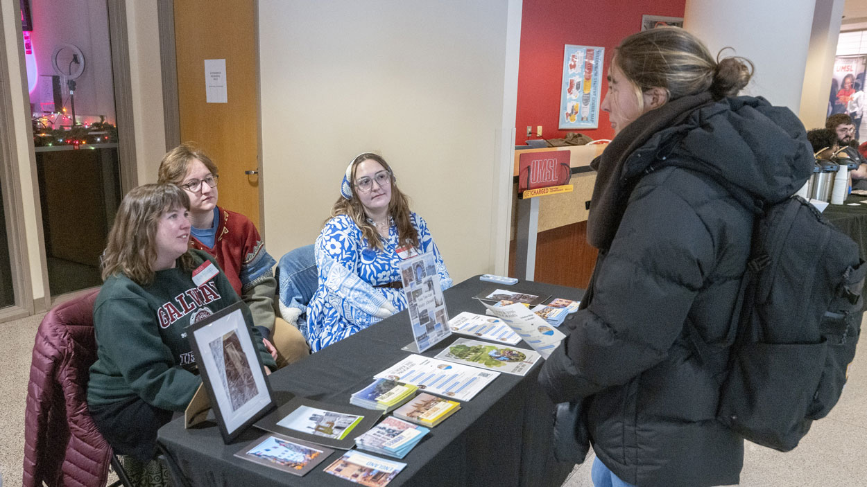 History students Kathleen Jochman, Tyler Winter and Eliza Stengle speak with freshman economics major Josefin Hansson about study abroad opportunities through UMSL while sitting at a table in the 2nd floor rotunda of the Millennium Student Center in early December.