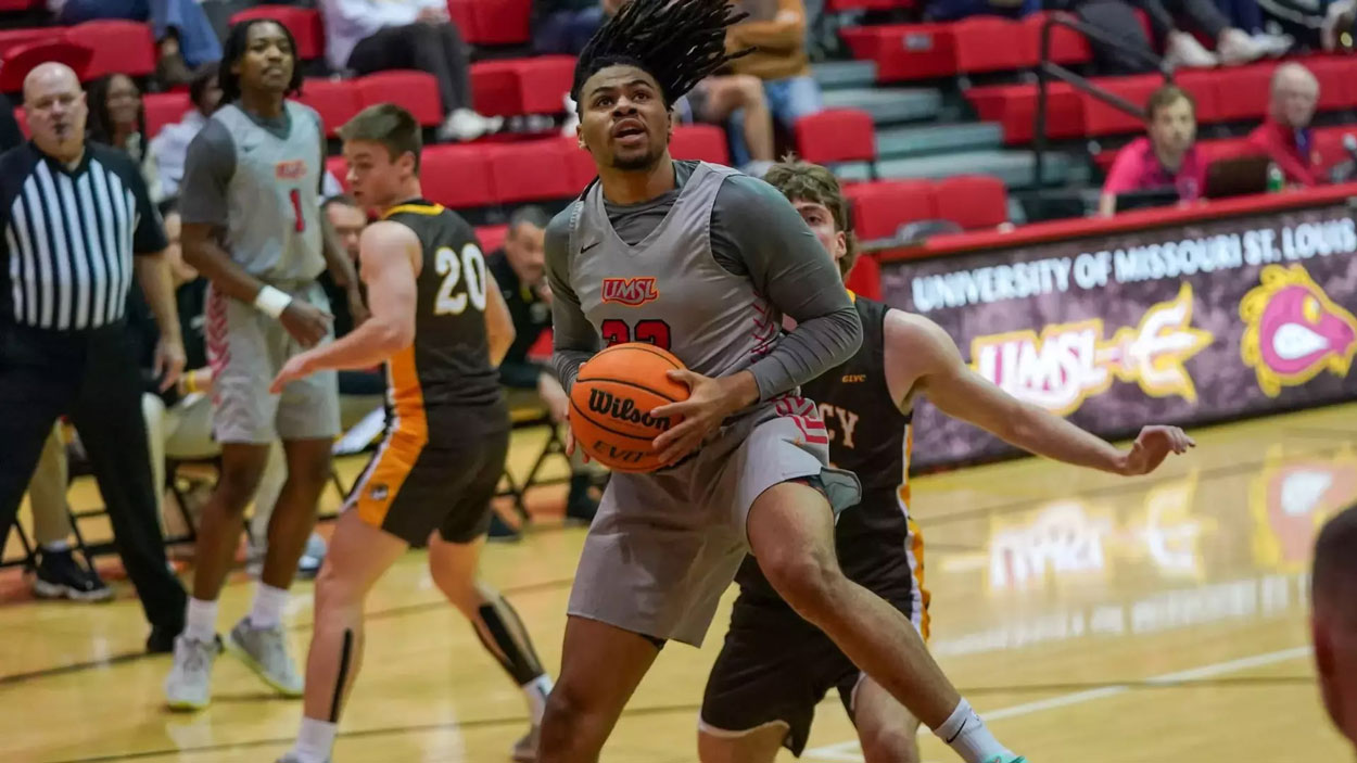 The University of Missouri–St. Louis men’s basketball team hit its season high in points while routing crosstown rival Maryville 99-72 on a snowy Saturday afternoon at the Mark Twain Athletic Center in its only game of the week. Taye Moore and Vincent Davis III each finished with 16 points to lead the Tritons, but Coach Bob Sundvold‘s team got contributions from up and down the lineup in the Great Lakes Valley Conference matchup. All 13 players who took the floor scored at least two points, and the team tallied a season-best 29 assists. Makeer Makeer and Demetris Phillips joined Moore and Davis in double figures with 15 points each. Phillips was perfect from the field, going 6 for 6 from the floor, including 3 for 3 from beyond the arc. Moore, Makeer and Quenton Parker – who finished with nine points – each also made three 3-pointers as the team went 17 for 33 from beyond the arc. UMSL shot 57.4% from the field, including 65.6% in the first half as it sprinted out to a 56-31 halftime lead. The Tritons never led by fewer than 19 points after intermission. UMSL (12-8, 6-5 GLVC) is on the road this week, visiting McKendree on Thursday and Illinois Springfield on Saturday.