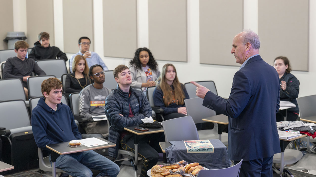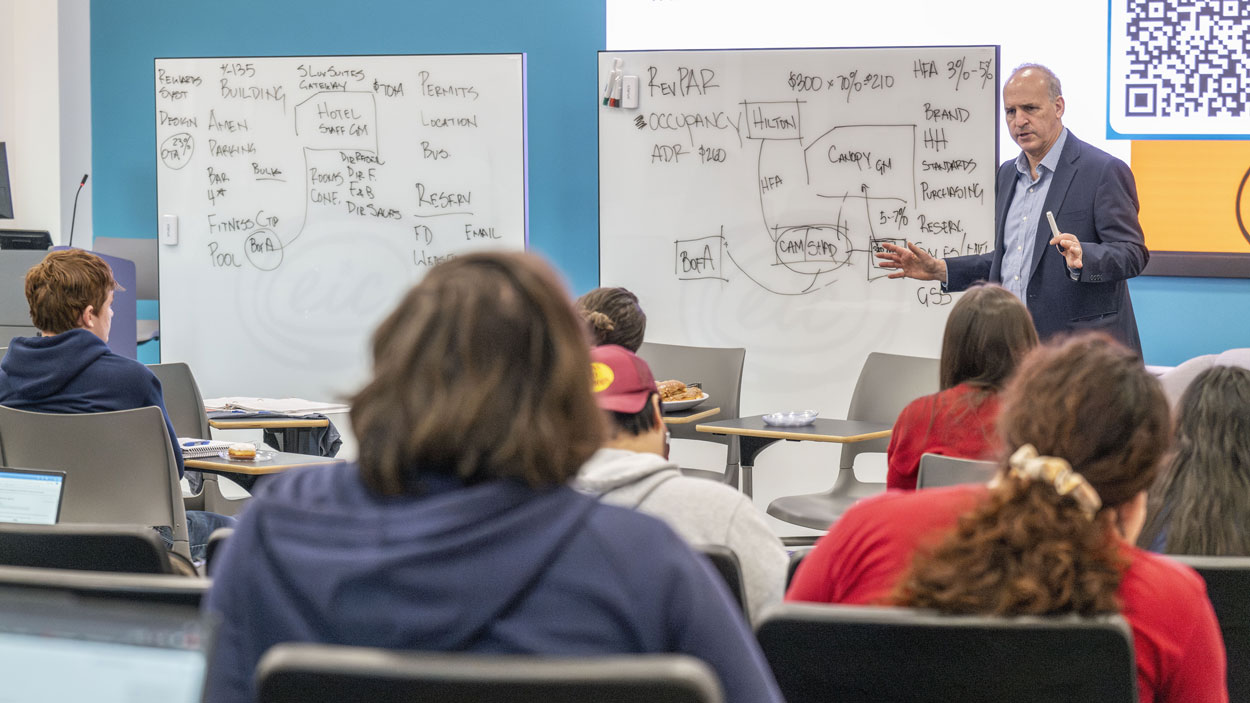 Steven Shapiro talks to students about some of the career opportunities that exist in the hotel industry, whether they want to own or operate a hotel franchise or work in the corporate office at one of the world’s leading hotel chains.