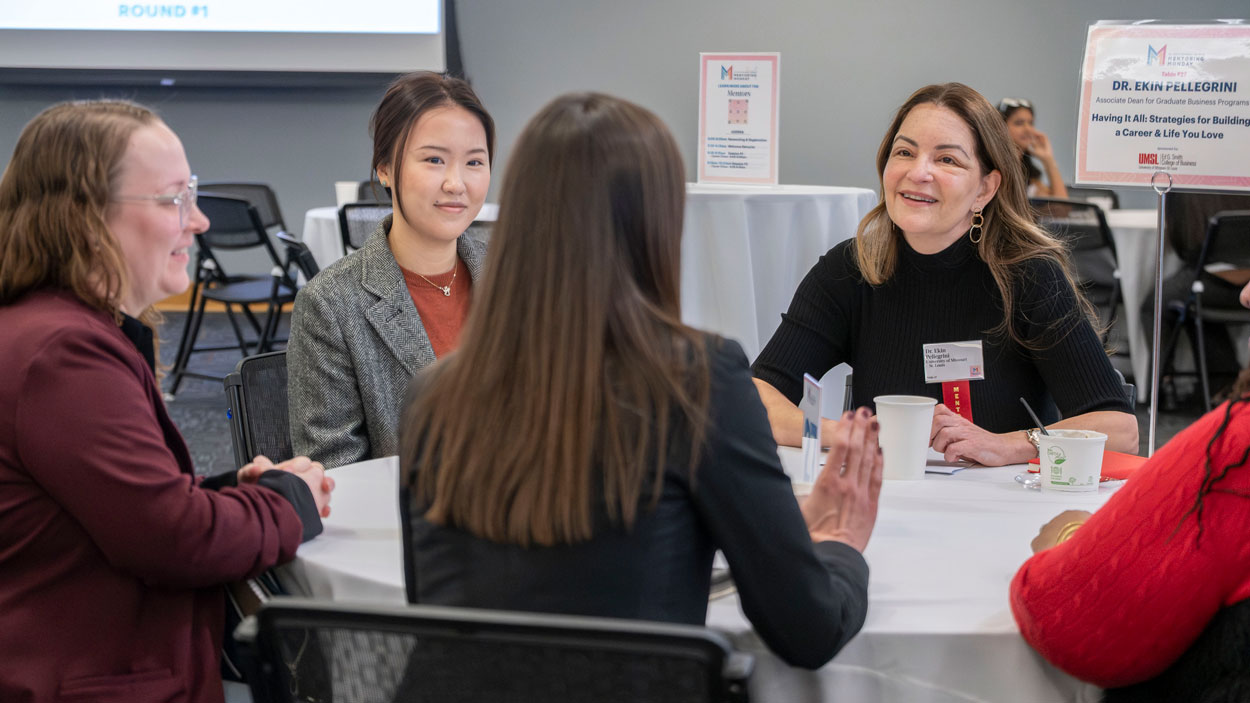Ekin Pellegrini (right), the associate dean for Graduate Business Programs and founding director of the Doctor of Business Administration program in the College of Business, led a small-group discussion during “Mentoring Monday” on Feb. 23 in the Century Rooms.