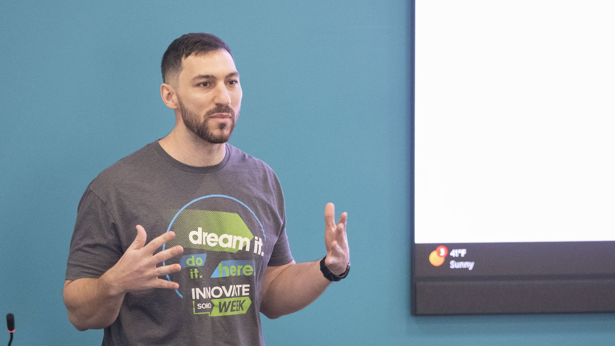 Mike Seper addresses the audience during a vibe coding workshop in the UMSL Innovation Center