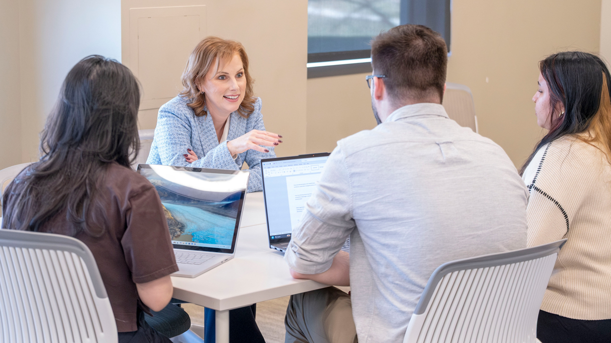 Beth DeCamp (left), a 2004 UMSL graduate and CFO in Boeing’s F-15 program, talks with students for an experiential learning project in Professor Brandon Ofem’s Strategic Management class, a capstone course in the Ed G. Smith College of Business.