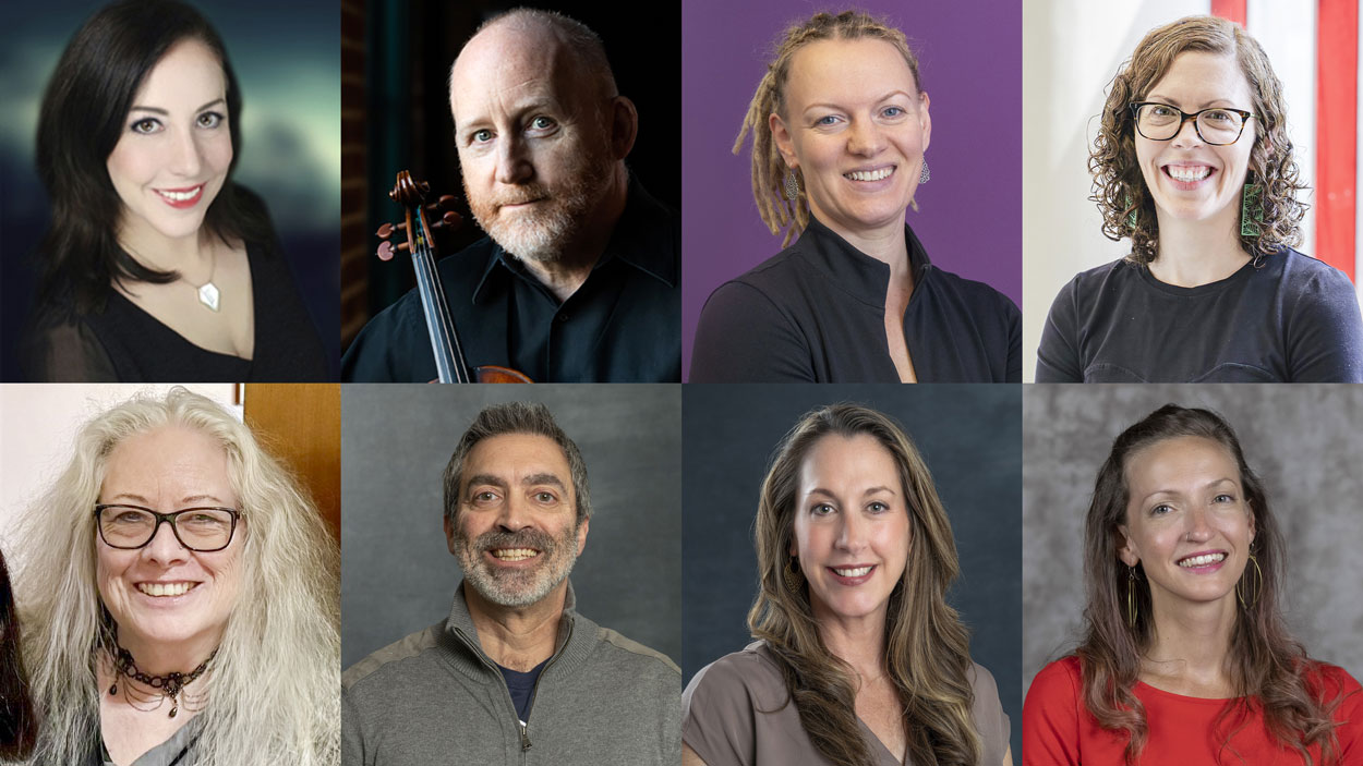 (Clockwise from top left) Stephanie Merritt, John McGrosso, Sandra Langeslag, Carissa Philippi, Annah Bender, Shannon Ahrndt, Marc Spingola and Laura Miller have been granted time to devote to research or course development during the fall or spring semester of the 2026-27 academic year. (Photo collage by Derik Holtmann)